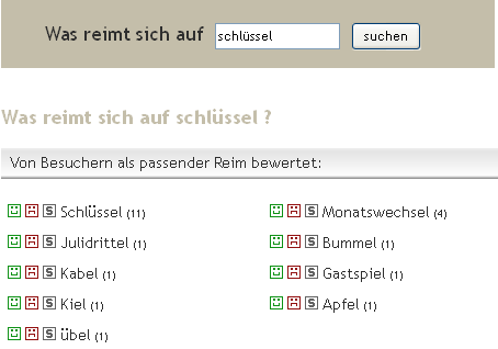 Den Namen hat die Reimemaschine übrigens von der Möglichkeit, über eine Suchmaske einen Reim zu suchen. Du schreibst selbst gerade ein Gedicht, aber dir fällt an einer Stelle absolut kein Reim ein? Dann schaue einfach auf dem Portal nach und gebe das Wort ein, für das du einen Reim suchst. Schon spuckt die Reimemaschine in Frage kommende Wörter aus! Diese Funktion steht und fällt allerdings mit der Ernsthaftigkeit der Benutzerwertungen. So kann bei jedem Vorschlag angegeben werden, ob der Reim passt oder nicht. Gut funktioniert das beispielsweise bei meinem Testwort “Herz” – bei “Schlüssel” allerdings sind die Suchergebnisse eher überraschend.